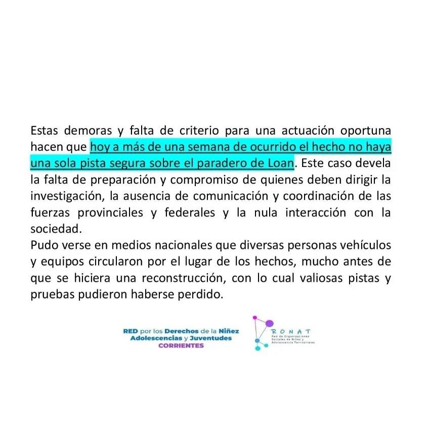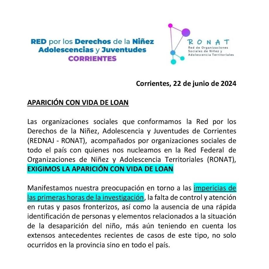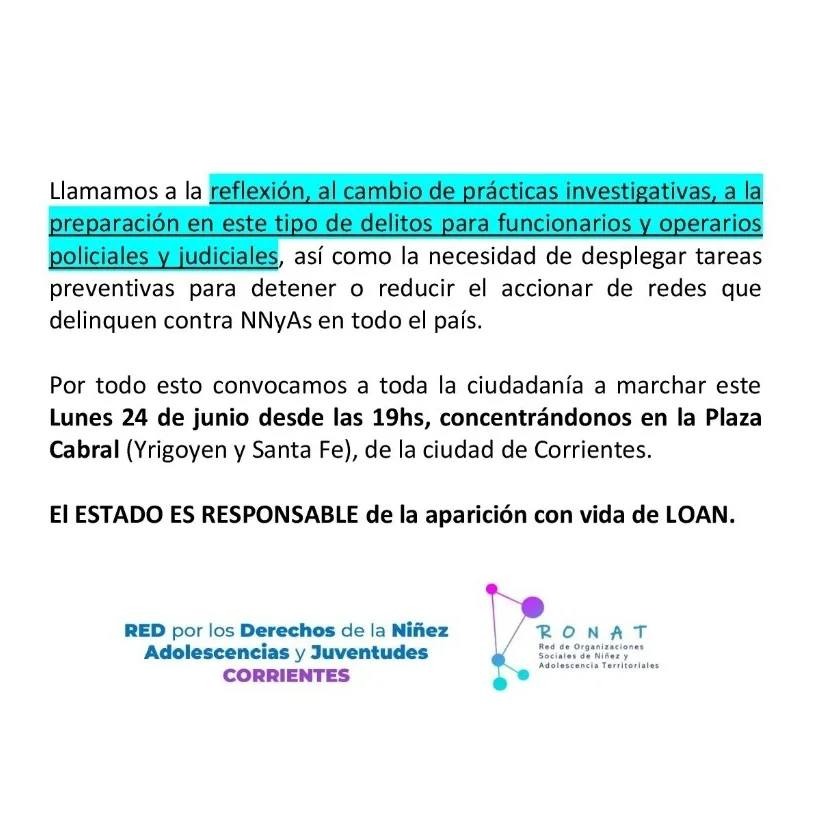 Compartimos la convocatoria de la Red de Organizaciones Sociales de Niñez y Adolescencia Territoriales (RONATS) en reclamo de la aparición con vida de Loan.