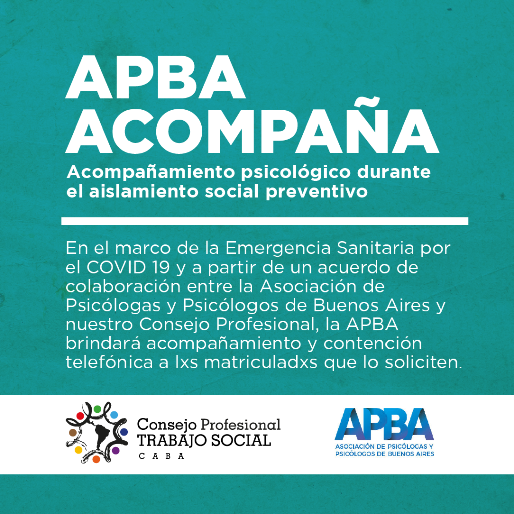 En el marco de la Emergencia Sanitaria por el COVID 19 y a partir de un acuerdo de colaboración entre la Asociación de Psicólogas y Psicólogos de Buenos Aires y nuestro Consejo Profesional, la APBA brindará acompañamiento y contención telefónica a lxs matriculadxs que lo soliciten.