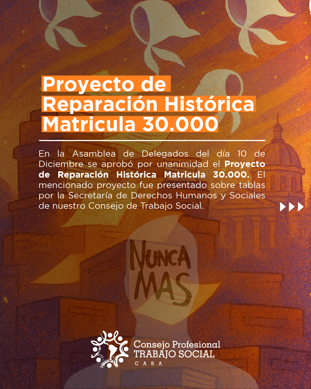 En la Asamblea de Delegados del día 10 de Diciembre se aprobó por unanimidad el *Proyecto de Reparación Histórica Matricula 30.000*. El mencionado proyecto fue presentado sobre tablas por la Secretaría de Derechos Humanos y Sociales de nuestro Consejo de Trabajo Social.