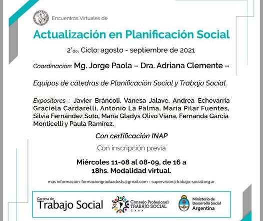 Curso Virtual de Actualización en Planificación Social Segundo Ciclo Agosto-Septiembre 2021 Organizado por: Carrera de Trabajo Social- Facultad de Ciencias Sociales- UBA Consejo Profesional de [...]