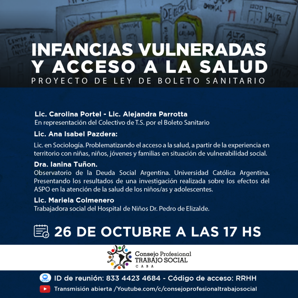 Somos un grupo de Trabajadoras Sociales que desde hace algún tiempo estamos trabajando en el Proyecto de Ley de “boleto Sanitario” para que NNyA puedan llegar a los centros donde atienden su salud. Creemos que es un derecho que debe ser garantizado por parte del Estado abriendo camino a la efectiva accesibilidad del mismo. El proyecto de Ley ingresó al Congreso de la Nación en marzo del corriente año, a la espera de ser tratado en las comisiones correspondientes.