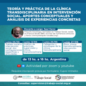 El Seminario-Taller es una actividad organizada en forma conjunta con la Carrera de Trabajo Social de la Universidad de Buenos Aires (UBA) y tiene como propósito introducir la clínica transdisciplinaria de la intervención social como útil instrumento de análisis y de emprendimiento. Esta clínica, que se diferencia en varios aspectos de la supervisión, trabaja el lazo entre ideología (valores, representaciones, objetivos) e inconsciente (configuraciones subjetivas) como clave para comprender las situaciones a las que se confronta teórica y prácticamente la intervención social.